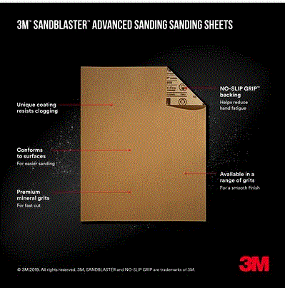 3M™ SandBlaster™ Abrasives are now better than ever, thanks to the combination of NO-SLIP GRIP™ backing and premium mineral technology providing 7X longer sheet life.