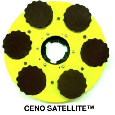 CENO Satellite Buffing Block. The Ceno Group’s Satellite discs fit any buffer, counter-rotate at 4 percent and turn at 600 rpm. They remove chatter and edger marks and flatten the floor three times faster than hard-plating, all while sanding the floor to a piano-top finish. Satellite discs reduce edging time by 50 to 70 percent, and they won’t remove spring wood.