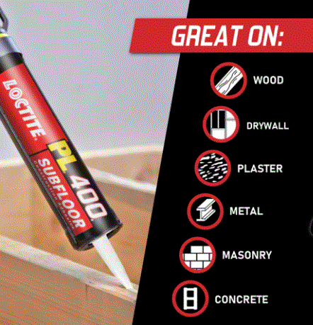 Loctite PL 400 VOC Compliant Subfloor & Construction Adhesive provides a powerful, permanent bond and is formulated for all heavy duty interior or exterior construction. Cold weather formula for easier extrusion and excellent adhesion in all weather conditions. Offers fast set and superior strength and development. Loctite PL 400 VOC is suitable for use in drywall, plaster, metal, masonry, concrete, brick, ceramic tile, slate, treated lumber and most other projects requiring an adhesive.