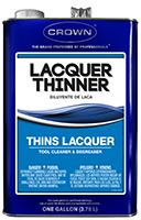 Crown® Premium Lacquer Thinner is a medium-slow evaporating thinner for use with lacquers and most epoxy coatings. It can be used to thin automotive lacquers, including acrylic undercoats and acrylic lacquer topcoats. This product has a slower evaporation rate than traditional lacquer thinner, providing better gloss results during conditions of high heat or humidity. It also effectively cleans brushes, rollers, and spray equipment after use.