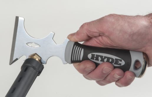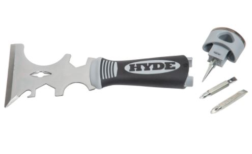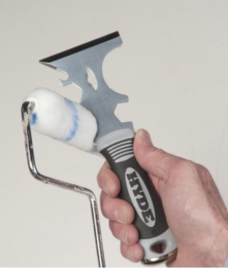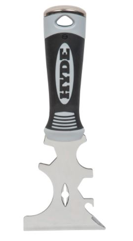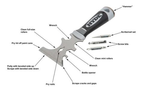 This patented multi-tool is the perfect worksite addition for any pro – but especially for pro painters who work with spray equipment. It accomplishes all the more common multi-tool functions (scrape flat surfaces and contours, spread putty, open out cracks, open bottles, pull nails or pound them in) but also incorporates many new ones.