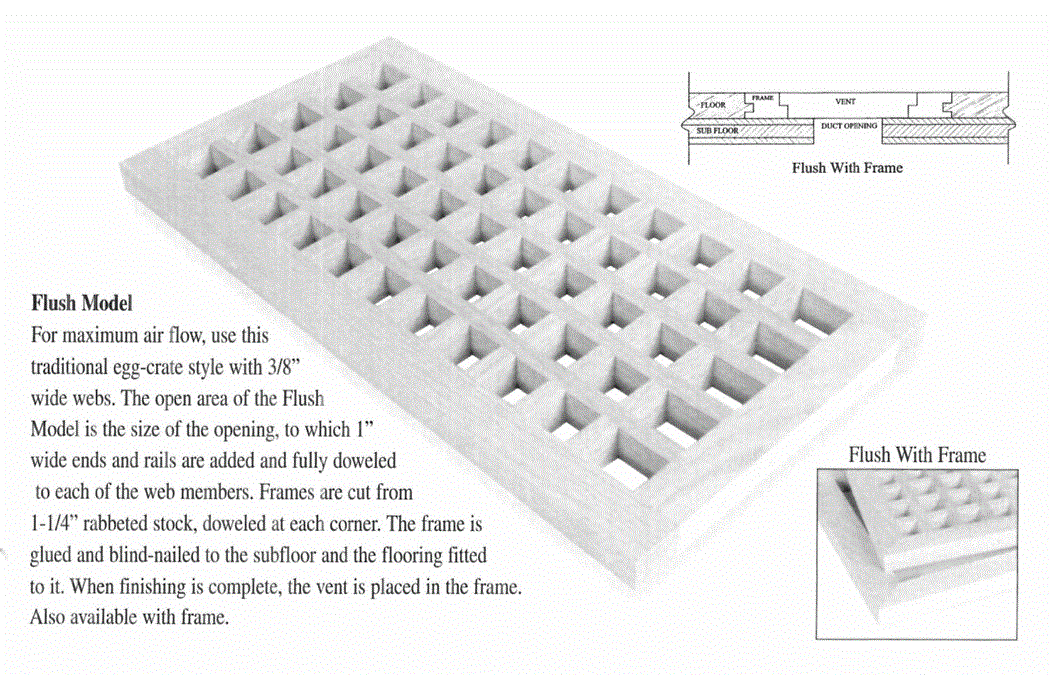 Slim, trim, flush styling with the cleanest look possible. Sets flat on the subfloor. The frame is set permanently while the vent is removable to permit cleaning of the duct throat. Delicate looking but tough. Best choice for cold air returns, with most open area.